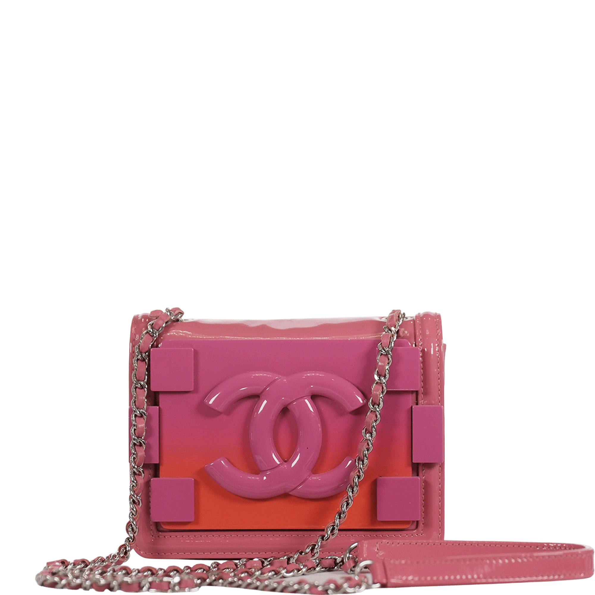 This playful handbag features the iconic interlocking CC logo in a bold, structured design inspired by Lego-style blocks. The bag includes a classic chain strap for crossbody or shoulder wear and opens to a compact interior perfect for carrying essentials with a modern Chanel statement.