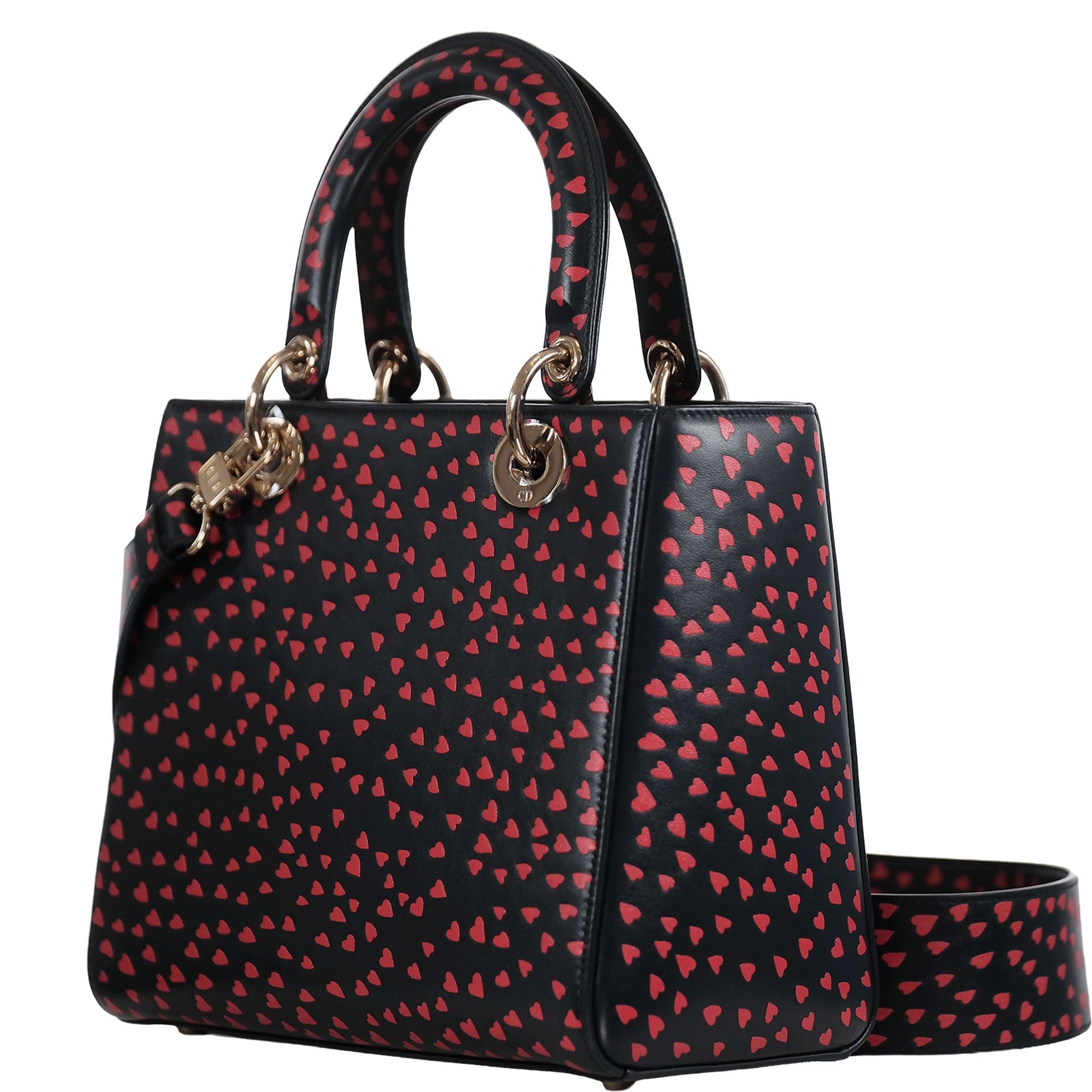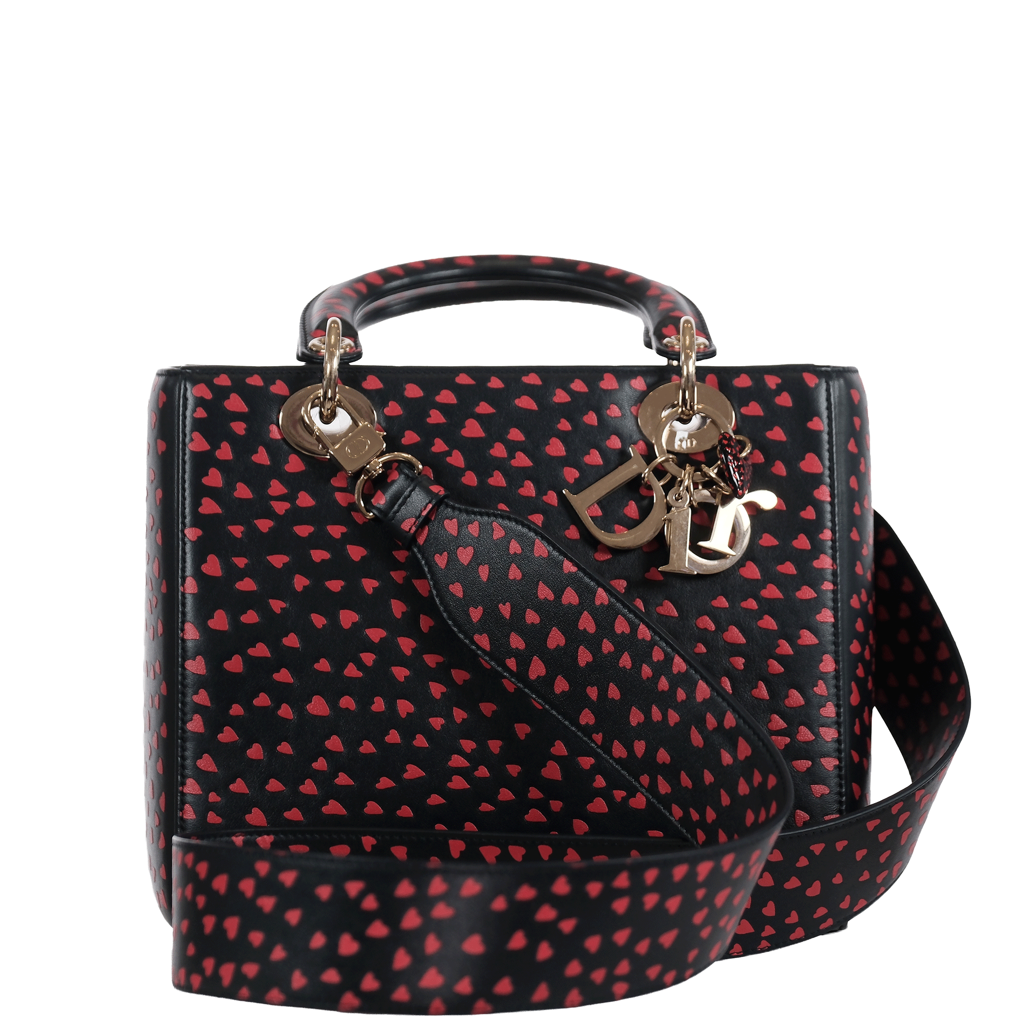 Authentic Dior Lady Dior “In Love in Paris” Limited Edition crafted in black lambskin leather with red heart print and gold-tone hardware.