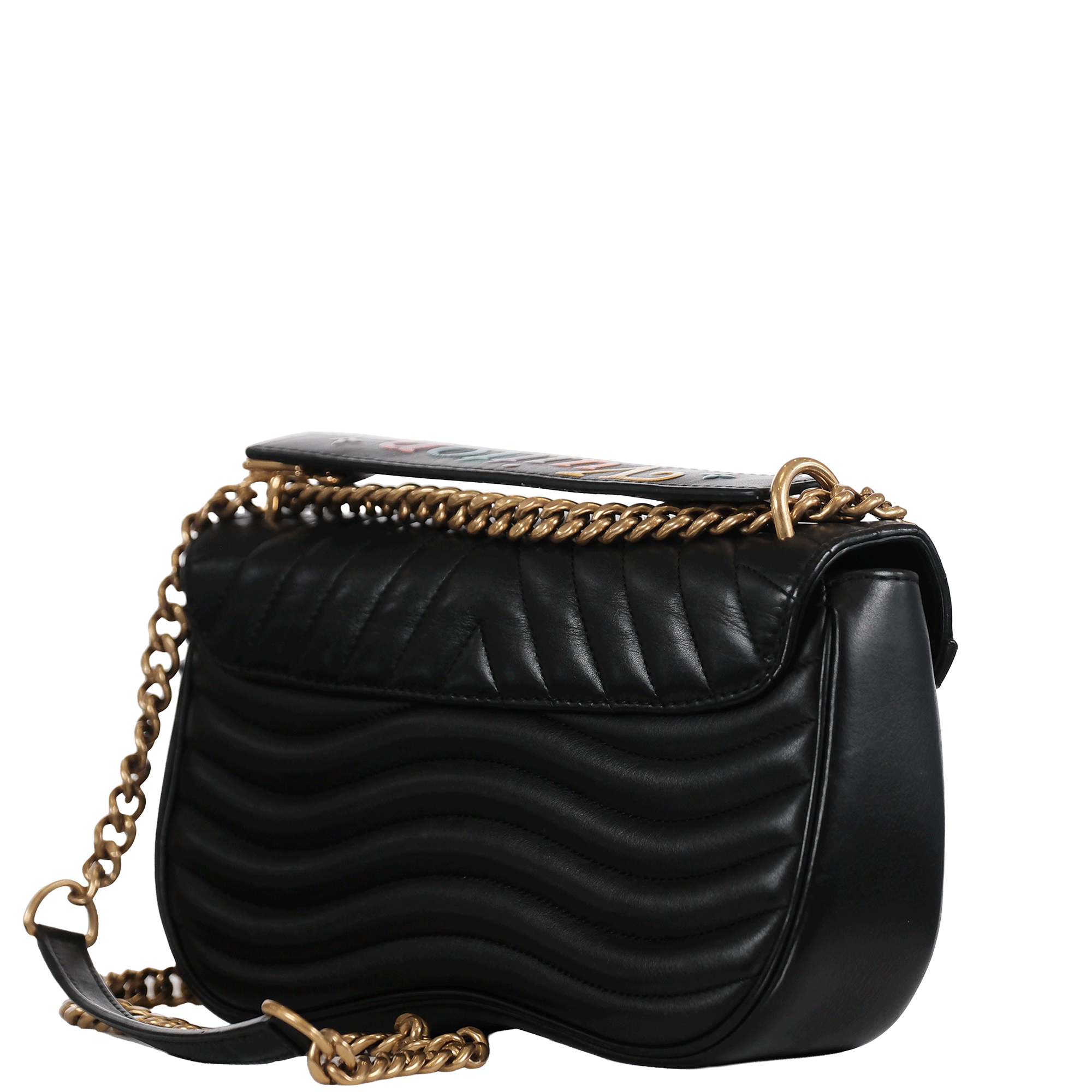 This stylish bag features the signature LV logo at the front, wave-pattern quilting, and a chain-link strap that can be worn on the shoulder or crossbody. The flap opens to a compact interior designed to carry essentials with modern Louis Vuitton flair.